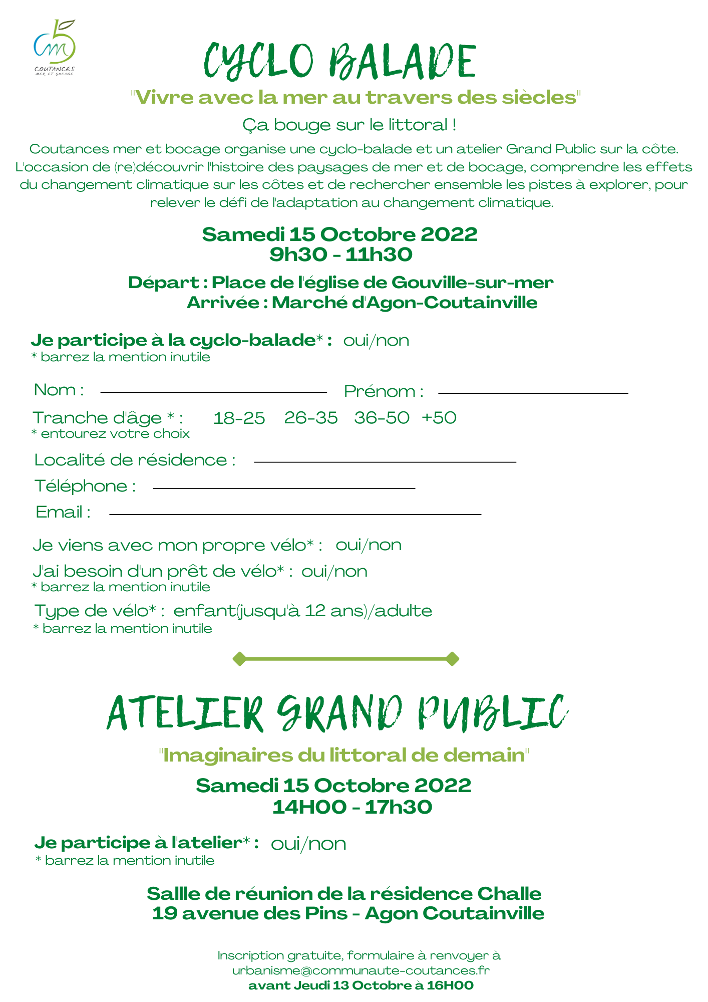 Entre mer et bocage, une cyclo-balade (re)découvrir l’histoire des paysages de mer et de bocage, de comprendre les effets du changement climatique sur les côtes, et de questionner ensemble les projets en cours et pistes à explorer pour relever le défi de l’adaptation au changement climatique.