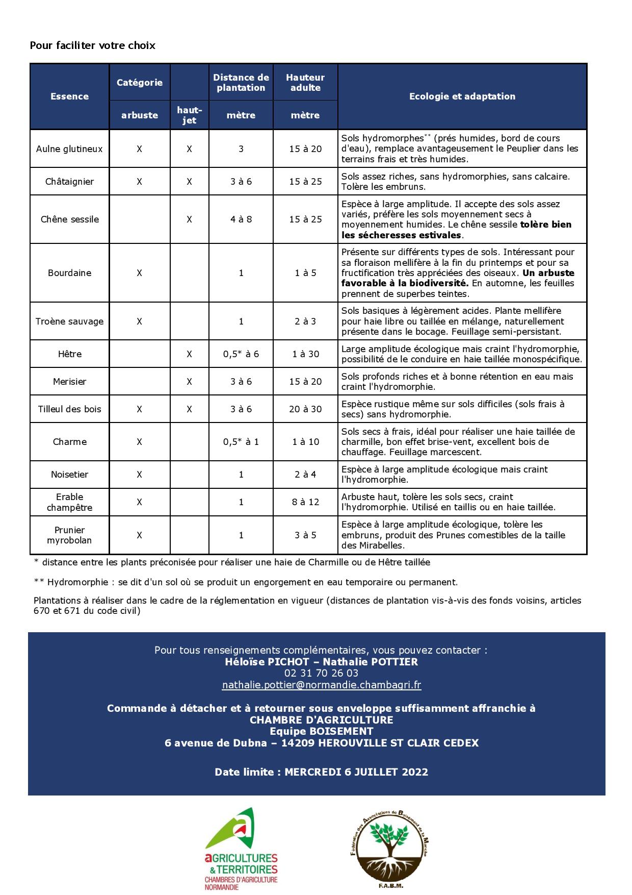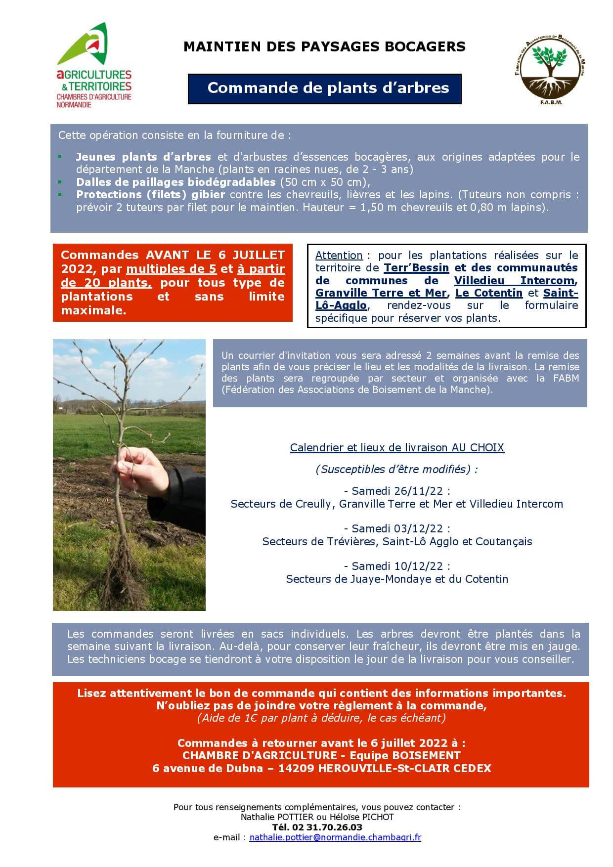 La Chambre d’agriculture de Normandie organise, une nouvelle opération de « commande groupée d’arbres ». Cette opération consiste en la fourniture de jeunes plants d’arbres d’essences bocagères adaptées au territoire et de dalles de paillages.
