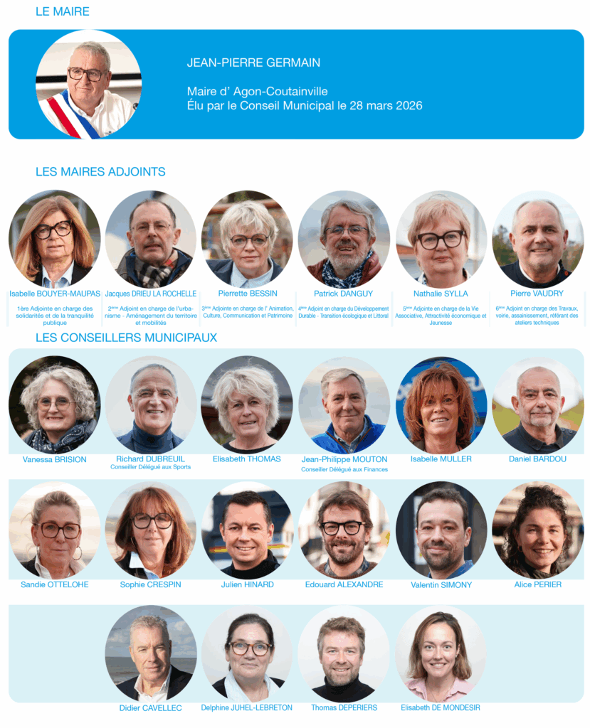 Le conseil municipal d'Agon-Coutainville siège depuis juin 2020. Il est composé de 21 élus réunis sous l'étiquette Divers Droite avec en tête M le maire Christian Dutertre.